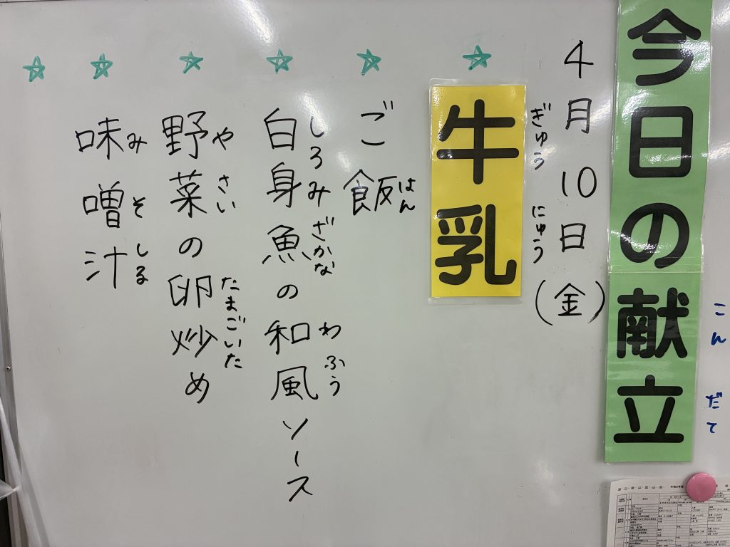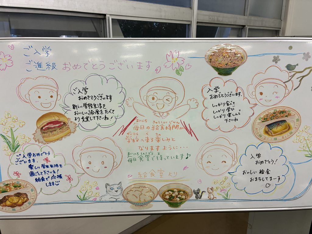 お知らせ 4月10日(金)給食がはじまって4日目になりました 2026年4月10日 栄養士さん、調理員さんが毎日安全でおいしい給食を準備しています。食堂には、栄養士さんからのあったかいメッセージと本日の献立が書かれていますので紹介します。